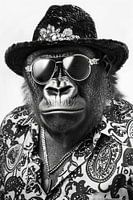 Een portret van een modieus geklede gorilla in zwart-wit. Hij draagt een zonnebril, een hoed en een shirt met patroon.