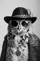 Een creatief zwart-wit portret van een uil, stijlvol gekleed met een hoed en bril. De uil draagt een halsketting en poseert elegant.