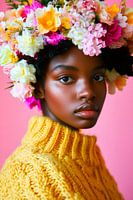 Hier ontvouwt zich een stralend gevoel van jeugdigheid, met liefdevol gerangschikte bloemen die het hoofd sieren. De combinatie van zachte kleuren en het warme geel van de trui straalt levensvreugde uit. Dit artistieke portret past perfect in een gezellige woonkamer of een inspirerende creatieve ruimte, waar het positieve energie kan…