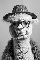 Een portret van een lama met een stijlvolle hoed en bril. Perfect voor creatieve of humoristische projecten.