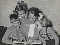 Familie foto waar ma Alblas voorleest aan Marijke, Ab en Joke.
