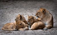 Portret van moeder leeuwin met haar welpen (babies) die tegelijkertijd een kant uit kijken. Zorg van moeder voor haar kinderen.