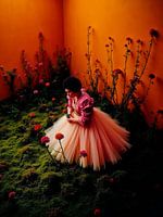 Het kunstwerk toont een vrouw - Moeder Natuur - in een pastelkleurige tule jurk, zittend in een hoek versierd met mos en hoge bloemen. De muren hebben een rijke oranje kleur. Het licht is warm en dramatisch en creëert een droomachtige, surrealistische sfeer.