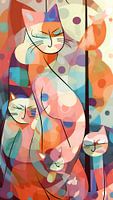Abstract portret van een moeder poes met haar kittens in pastel kleuren.