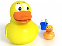 De kleine eendje, met zijn geel rood gestreepte baseball pet kijkt omhoog naar zijn moeder.