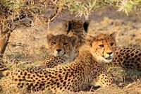 Twee schattige cheetah welpen en moeder liggen in het gras onder een boom in de Kalahari woestijn in Botswana, Afrika. Natuur, dieren