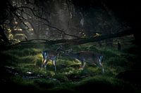 Twee damherten, moeder en dochter tijdens een mistige zonsopkomst met zonnestralen in het bos. Hertenbronst in de AWD, amsterdamse waterleiding duinen in Nederland.