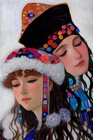 "Kostbare Band: Een Moeder en Dochter" is een werk dat de kijker meeneemt op een reis door de tijd en culturen, geïnspireerd door de iconische stijl van Gustav Klimt. In dit kunstwerk staat de innige band tussen een moeder en haar dochter centraal, versterkt door de prachtige Mongoolse klederdracht die ze dragen.