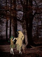 Moeder en dochter (met hondje) in jaren 20 stijl kleding in het bos. Let op: de foto op de achtergrond is een autochrome. Een van de eerste manieren om kleurenfoto's te maken. Het lijkt dat het een ruizige foto is, maar je ziet de gekleurde zetmeelkorrels. Dit werk is samengesteld uit beelden uit de collectie van het Rijksmuseum in…