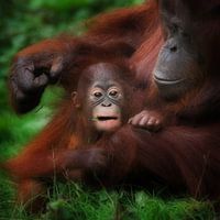 Een kleine Orang-oetan in de veilige armen van de moeder