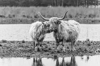 Schotse Hooglanders, moeder en kind, staan liefdevol bij elkaar op een eilandje in het water. Deze blonde Schotse Hooglanders staan in een natuurgebied dat wordt beheerd door Natuurmonumenten.