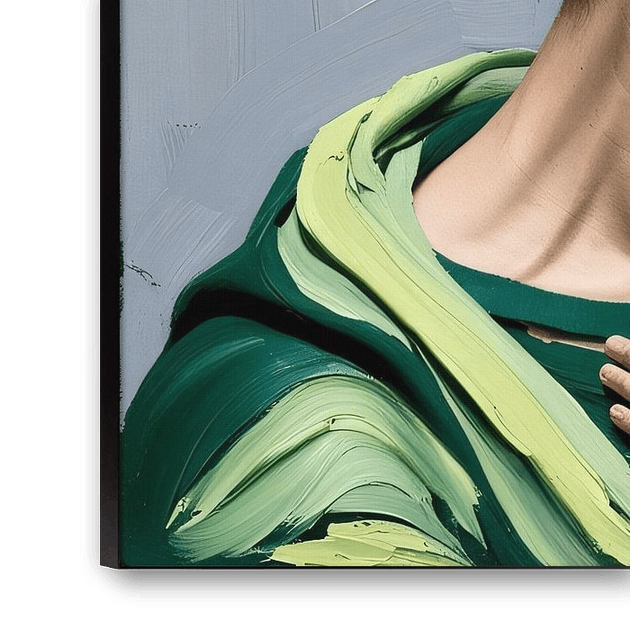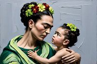Dit prachtige portret toont een intiem moment tussen een moeder en haar kind. De realistische stijl benadrukt de diepe emotie en verbondenheid tussen de twee. De zachte kleuren van groen en geel contrasteren mooi met de levendige rode bloemen in het haar van de moeder, wat het gevoel van zorg en liefde versterkt. Het ontwerp straalt warmte en tederheid uit, perfect voor elke ruimte die een gevoel van rust en verbondenheid nodig heeft. Deze afbeelding zou een mooie toevoeging zijn aan een woonkamer, slaapkamer of eetkamer, waar het een zachte, maar krachtige sfeer toevoegt. Een echt tijdloos stuk dat zowel klassiek als modern aanvoelt.
