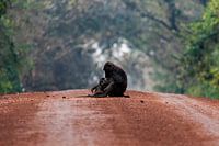 Een vrouwtjesbaviaan met haar kind midden op de weg.