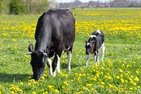 Bonte moeder koe graast met pasgeboren kalfje in weide met bloeiende gele paardenbloemen. Deze foto heb ik genomen in de Noord-oost polder in het voorjaar. In de lente staan de gele paardenbloemen te bloeien. Dit kalfje mag met de moeder lekker in de wei lopen.