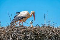 Moeder met baby ooievaar aan het voeren op het nest