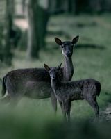 Prachtig portret van een moeder met haar jong. Deze damherten zijn gefotografeerd op de veluwezoom in de avond.