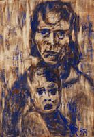 In dit moderne kunstwerk staan een vrouw met haar kind op het portret. De dominante kleur is bruin, maar ook blauw wordt gebruikt.