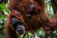 Een moeder orang-oetan met jong in de jungle en regenwouden van Bukit Lawang, in Midden-Sumatra, Indonesië.