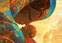 Moederliefde | Golden Embrace - Dit moeder en kind schilderij toont een teder moment van een vrouw die haar baby voorzichtig kust, beide versierd met geavanceerde gouden en blauwe patronen, uitgevoerd in een warme, moderne stijl die rijk is aan kleur en emotie.