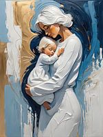 Een prachtig portret dat de onvoorwaardelijke liefde tussen een moeder en haar pasgeboren baby vastlegt. Met elke penseelstreek voel je de tedere omhelzing, de warmte van moederlijke liefde die de ruimte vult. De baby ligt rustig in de armen van zijn moeder, volledig ondergedompeld in de geborgenheid en veiligheid die alleen een moeder kan bieden. Gemaakt in mooie blauw teinten.