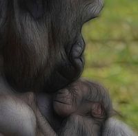 Moederliefde! Moeder gorilla heeft haar baby dicht tegen haar aan. Haar lippen drukt ze tegen het hoofdje van haar baby.