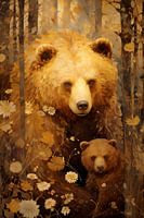 Een kleurrijk digitaal schilderij van een moeder grizzly die liefdevol haar jong beschermt. Het werk geeft een warme en rustieke uitstraling aan uw interieur!