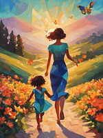 Laat je betoveren door deze levendige digitale schildering van een ontroerend moment tussen moeder en dochter. In een landschap dat baadt in goudgeel zonlicht, rent een liefdevolle moeder haar dochter tegemoet met open armen — een beeld van pure vreugde en verbondenheid.