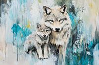 Een prachtig kunstwerk dat de band tussen een moederwolf en haar jong op ontroerende wijze vastlegt. Met zachte penseelstreken en een harmonieus kleurenschema van blauw, wit, en beige, voegt dit ontwerp een serene en beschermende sfeer toe aan elke ruimte. Perfect voor liefhebbers van natuur en dierenkunst, en een mooie aanvulling op moderne interieurstijlen.