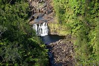 De Kapehu stroom vlakbij de stad Hilo op het Grote Eiland in Hawai'i, VS is moeilijk te voet te bereiken. Nou ja, tenzij je van junglewandelen houdt. Gelukkig is het een stuk eenvoudiger om de verschillende watervallen vanuit de helikopter te bekijken.