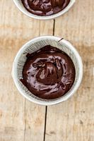 Moelleux aux chocolat in een timbaaltje voordat ze de oven in gaan. Op een houten ondergrond.