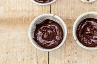 Moelleux aux chocolat in een timbaaltje voordat ze de oven in gaan. Op een houten ondergrond.