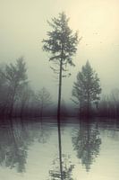 Bomen in de mist die reflecteren op het gladde oppervlak van een meer. Gemanipuleerde monochrome fotografie