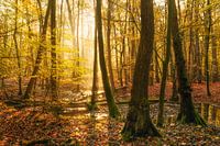 Een herfstbos waar de kronkelende bomen en de lichtinval voor een magische sfeer zorgen.