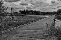 Het houten fietspad en de naastgelegen houten tjasker op het Grolloërveld in Drenthe.