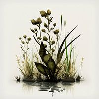 Der blasse, fast minimalistische Hintergrund betont die strukturelle Schönheit der Pflanzen und lässt jede Kurve der Blätter und Stängel wie eine botanische Illustration hervorstechen. Trotz ihrer Einfachheit vermittelt die Komposition Fülle – die gegenseitige Abhängigkeit von Arten, die in einem gemeinsamen Lebensraum gedeihen, in dem sich das Leben ständig an die sich verändernden Bedingungen von Wasser und Boden anpasst.