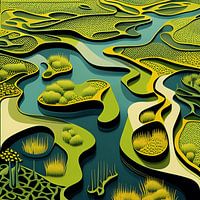 Het schilderij met de titel "Moerasmozaïek" toont een gestileerde, abstracte weergave van een uitgestrekt moerassysteem dat lijkt op een levende kaart van onderling verbonden moeraseilanden en kronkelende waterkanalen. De scène is weergegeven in een palet van weelderig groen, zacht geel en koel blauw, en illustreert het dynamische en…
