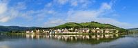 Prachtige panoramische opname van het dorpje Zell (an der Mosel) aan rivier de Moezel in Duitsland tijdens een mooie zomerochtend met reflectie en blauwe lucht met wolken