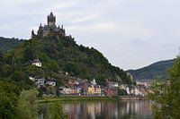 Aan de Moezel met zicht op Cochem. Kleurrijke huizen spiegelen in het water. Op de berg het kasteel.