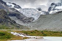 Prachtige landschap opname van de terugtrekkende Moiry gletsjer in de Zwitserse Alpen nabij Grimentz in de Val d'Anniviers vallei in het kanton Wallis in Zwitserland in de zomer met dreigende lucht