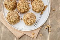 mokka gebakjes met geroosterde hazelnoten op een wit bord en houten ondergrond.