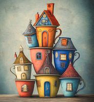 Een grillige verzameling van theekopvormige huisjes zijn creatief gestapeld en elk versierd met deuren, ramen en verschillende daken. De levendige kleuren en het fantasierijke ontwerp creëren een speelse en betoverende sfeer.