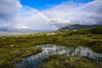 Een regenboog verschijnt boven de vochtige hoogvlakten nabij het meer Aursjøen, in het desolate landschap van Dovrefjell, Noorwegen.