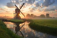 De serene gloed van de zonskomst geeft de molen een sprookjesachtige sfeer.
