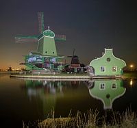 Molen De Gekroonde Poelenburg, De Kat, De Zoeker, De Bonte Hen aan de oever van de Zaan in floodlight, Zaandam, Noord-Holland