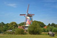 De Graanhalm in Burgh-Haamstede is een in 1847 gebouwde stellingkorenmolen. In en rond deze markante witte molen is een pannenkoekenrestaurant gevestigd. Sinds een aantal jaren kan op windkracht ook een zaagraam worden aangedreven voor het demonstreren van het zagen van hout. Op de foto is de stenen romp voorzien van een tijdelijk kunstwerk. De kleppen van de wieken worden bediend met een afstandsbediening!
