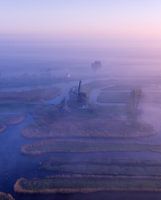 Dit is molen De Havik in Grootschermer. Deze luchtfoto is gemaakt tijdens een mistige zonsopkomst