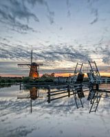 De verlichte molen met ophaalbrug bij een zonsondergang in september