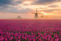De zon komt net door de wolken heen. Er hangt nog een mooi laagje mist wat deze foto een fantastische rustige sfeer geeft. Deze Hollandse foto staat prachtig in ieders huis. De kleur, de rust en de echte Hollandse tulpen en molen.