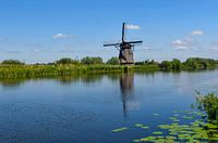 Mooi Nederlands landschap met een oude historische windmolen langs het water bij Kinderdijk. In het water is een mooie spiegel reflectie te zien van de blauwe lucht met wat wolken en de molen zelf,