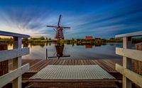 Molen bij Kinderdijk met een steiger op de voorgrond.